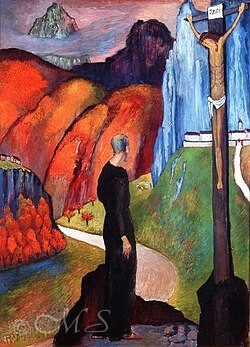 By now she had devoted many years to Jawlensky who treated her dreadfully. Because her pension was from the Tzar she was not allowed to marry but she continued to support her lover. Werefkin led a convoluted life full of betrayals, jealousies, lies, and deceits related to him all the while continuing to paint. She experimented with gouache and tempera using vibrant colors and bold shapes. She emulated other Expressionists like Gauguin, Emil Nolde, and Edvard Munch. She founded the Brotherhood of St. Luke whose members followed the tradition of the Guild of Saint Luke.