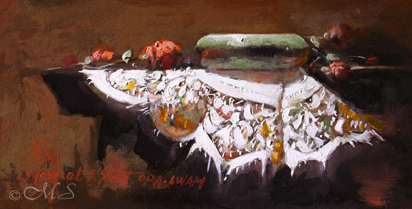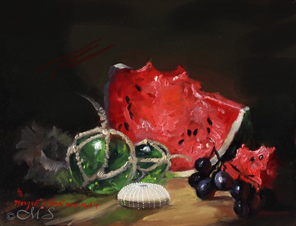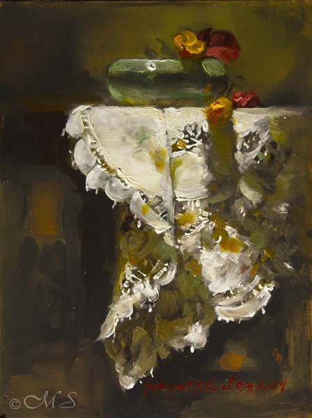Oil painting with the chiaroscuro technique illuminates the focus area with a strong light. All other areas are painted with less detail, lower values, and intensity of color giving a mysterious appearance. By putting one or two objects in the important focus area, a strong but simple composition will emerge. Combining these oil painting techniques with a selection of superior natural pigments and oil paints result in the beautiful and evocative quality known as Chiaroscuro Painting.